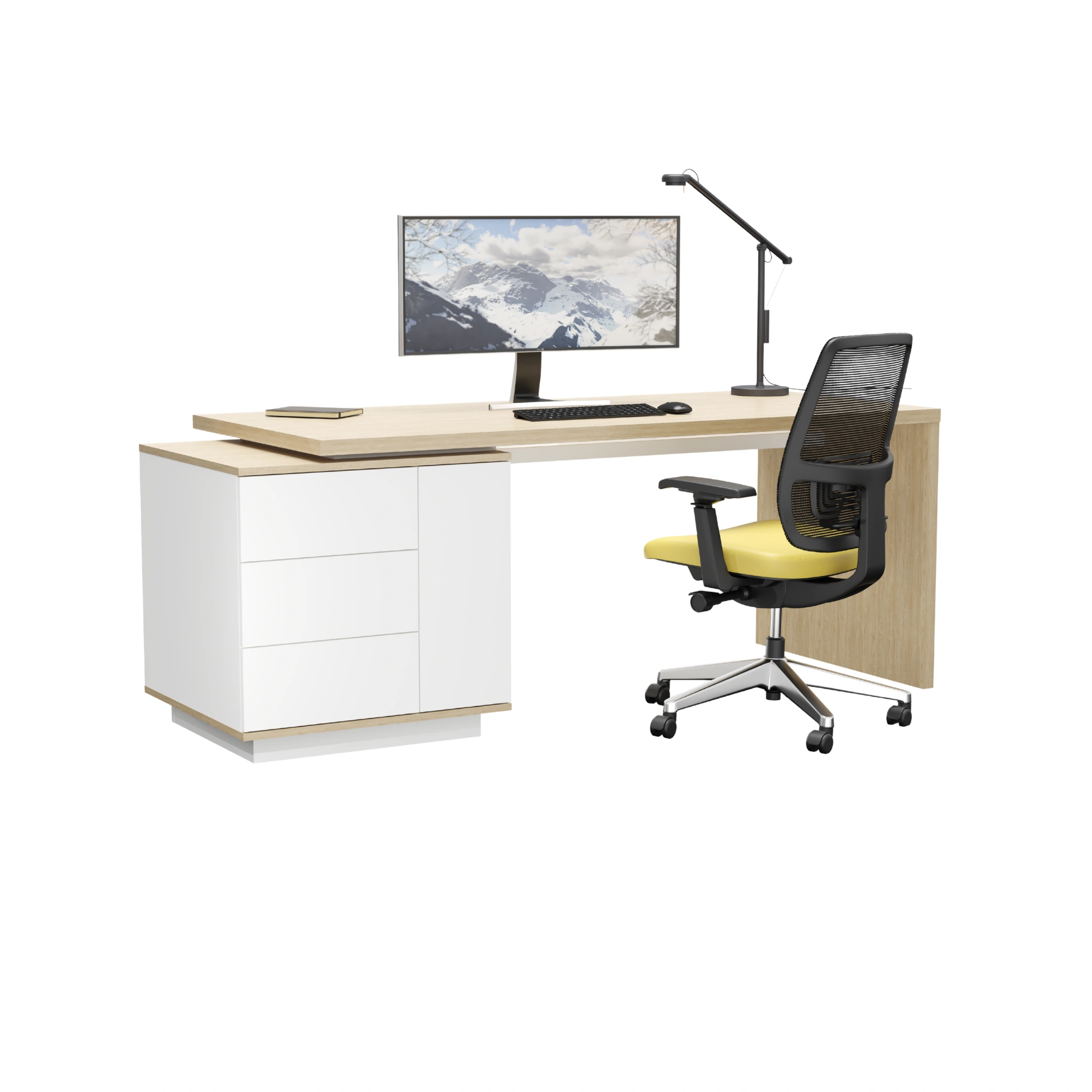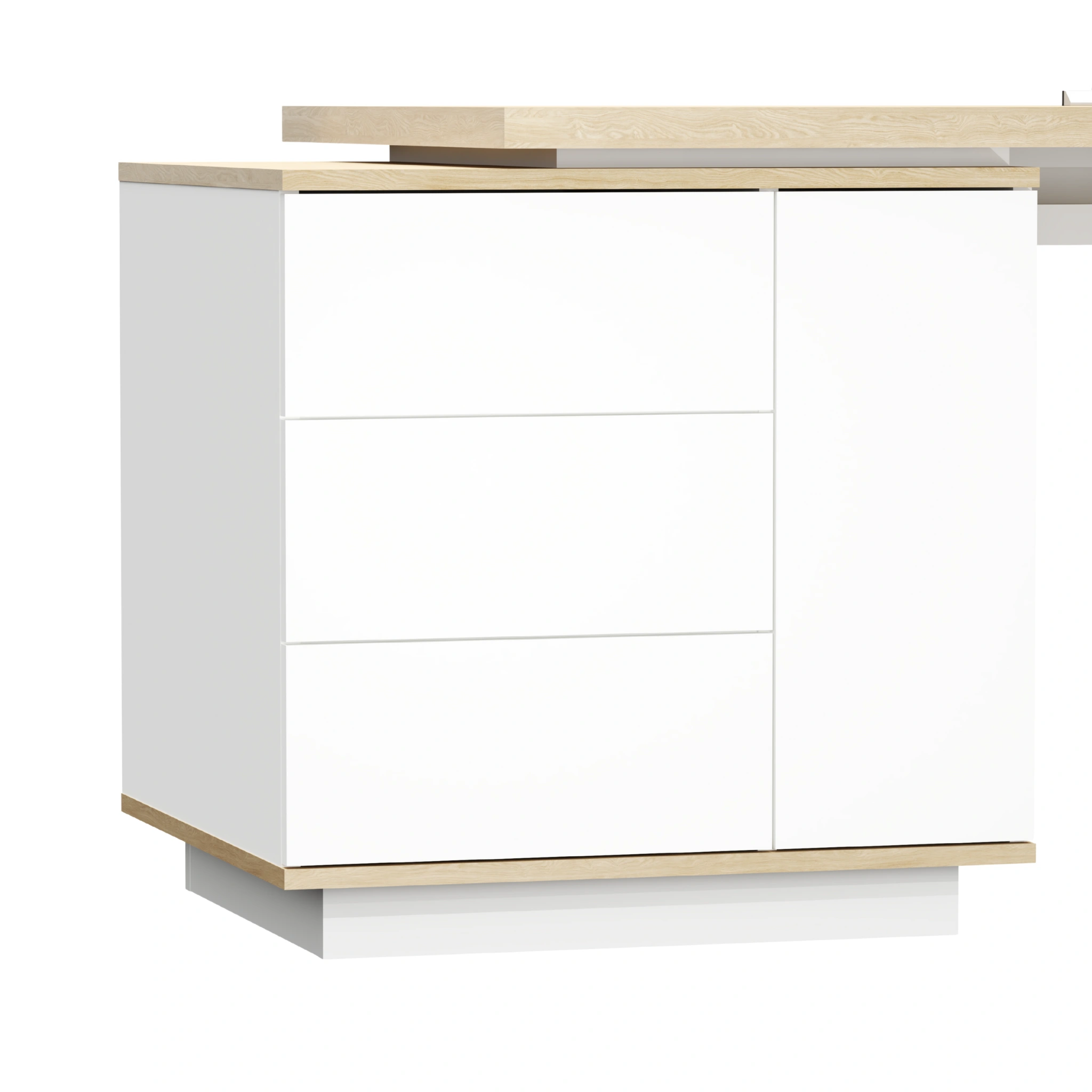Kontenerek, na którym opiera się biurko, to połączenie elegancji i funkcjonalności. Wykonane z laminowanej płyty wiórowej, oferuje: