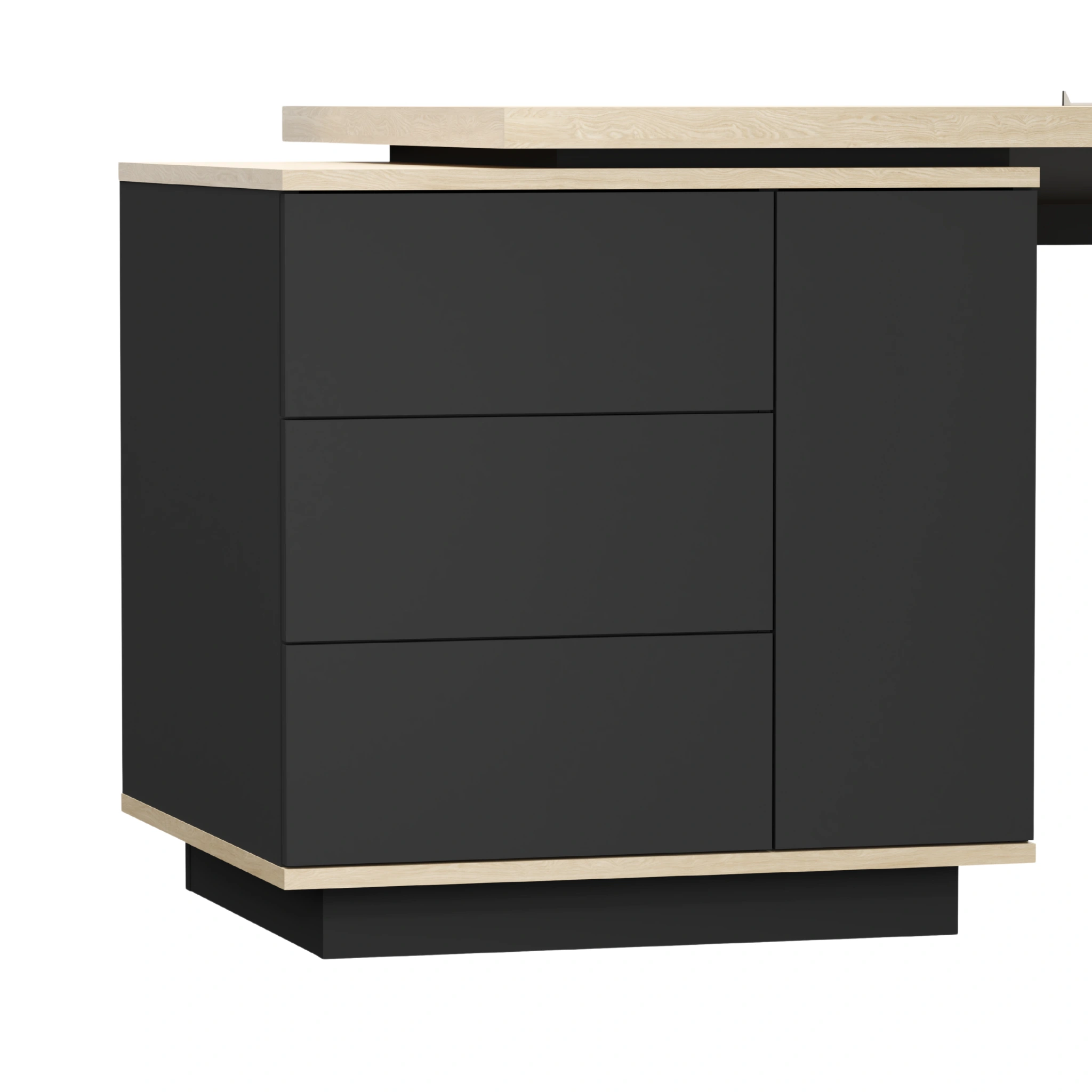 Kontenerek podkreśla czarny cokół o nowoczesnym wyglądzie. Wymiary 700 x 650 x 702 mm pozwalają na wygodną organizację miejsca pracy. Otwieranie w systemie tip-on sprawia, że korzystanie z komody jest wyjątkowo komfortowe.